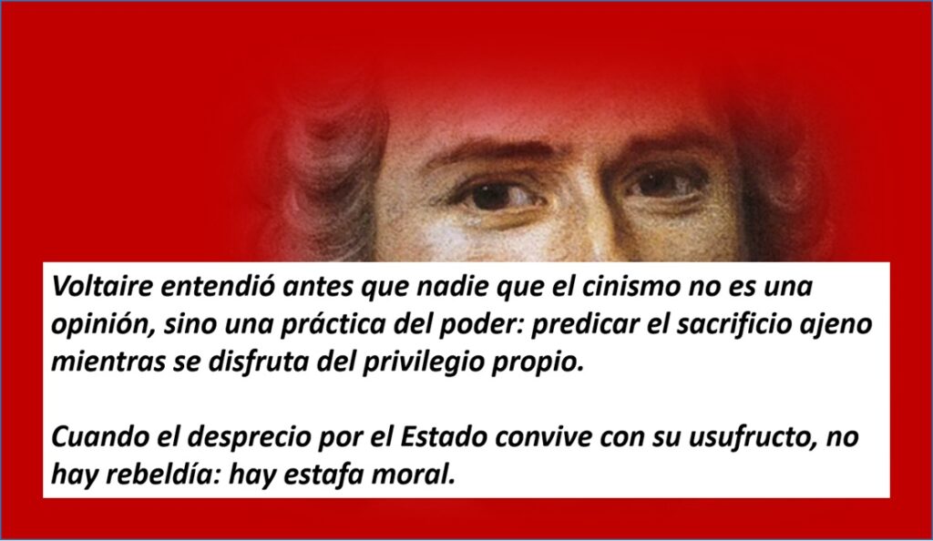 Y esa farsa se derrama. Se vuelve clima de época. Se vuelve ejemplo. Se vuelve pedagogía negativa. Esta gente está haciendo del cinismo una militancia activa.