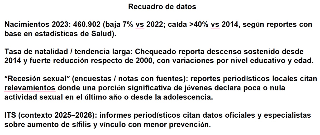 El otro dato -más resbaladizo, porque depende de encuestas- es el que circula con nombre provocador: “recesión sexual”. Medios locales vienen recogiendo investigaciones y relevamientos que muestran, sobre todo entre jóvenes, un descenso en la actividad sexual respecto de décadas previas, con porcentajes no menores de quienes declaran no haber tenido relaciones en el último año o durante largos períodos.