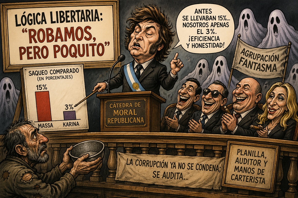 He allí el catecismo completo de la nueva política argentina. No importa robar: importa cuánto. No interesa la conducta: interesa la comparación. La corrupción ya no se condena; se audita. El ladrón dejó de ser delincuente para convertirse en administrador eficiente. Para los libertarios, el robo al Estado no se discute, sino que hay que conversar el porcentaje.