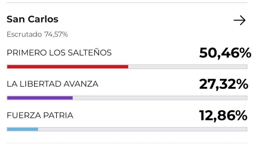 Distinta fue la situación en el municipio vecino de San Carlos, donde su intendente, María del Carmen Vargas, ha demostrado compromiso y transparencia en su gestión y donde los resultados patentizan su cercanía con los vecinos, como lo demuestra el cuadro de resultados: